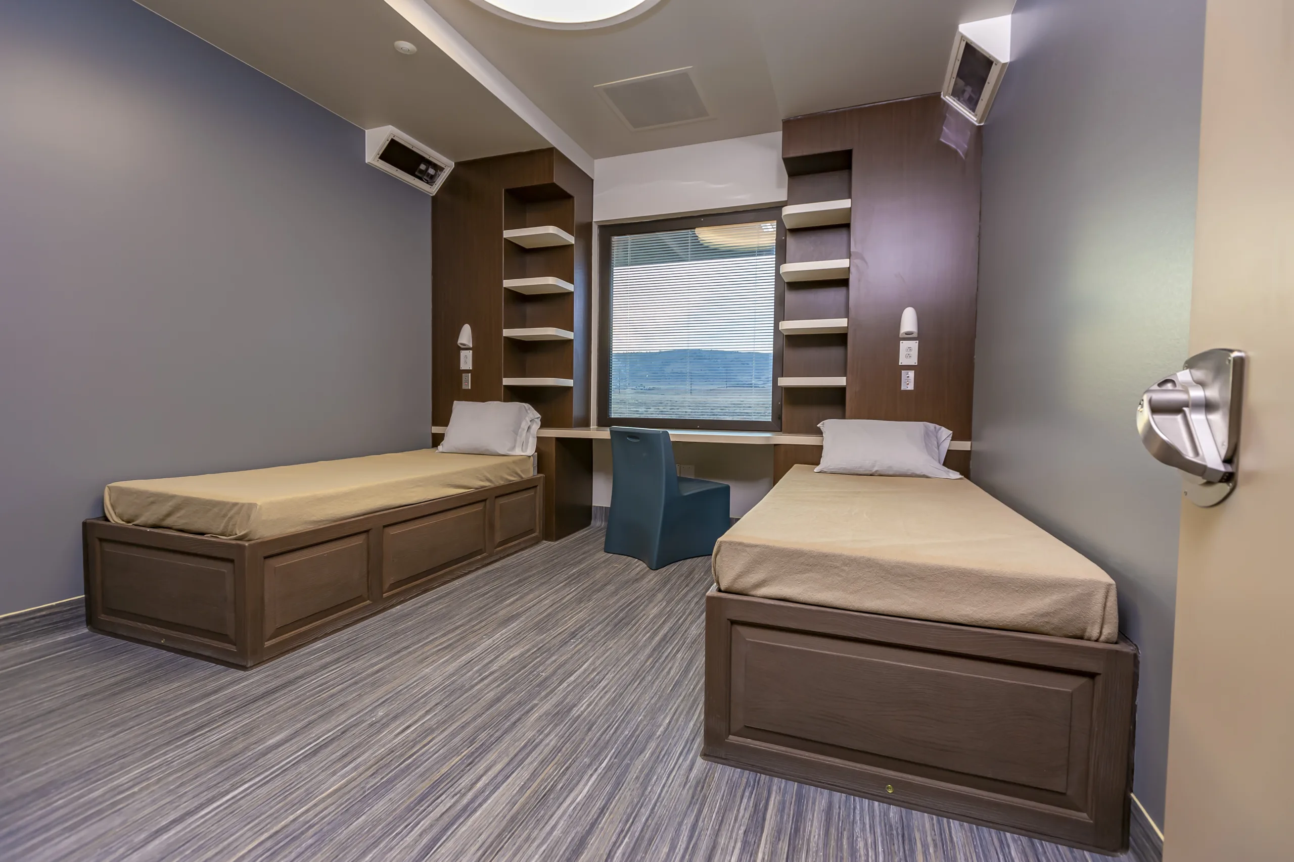 - A modern room with two single beds, a central window featuring a scenic view, a blue chair, and built-in wooden shelving on either side. The walls are painted in a soothing gray with matching flooring. The room is well-lit and organized.