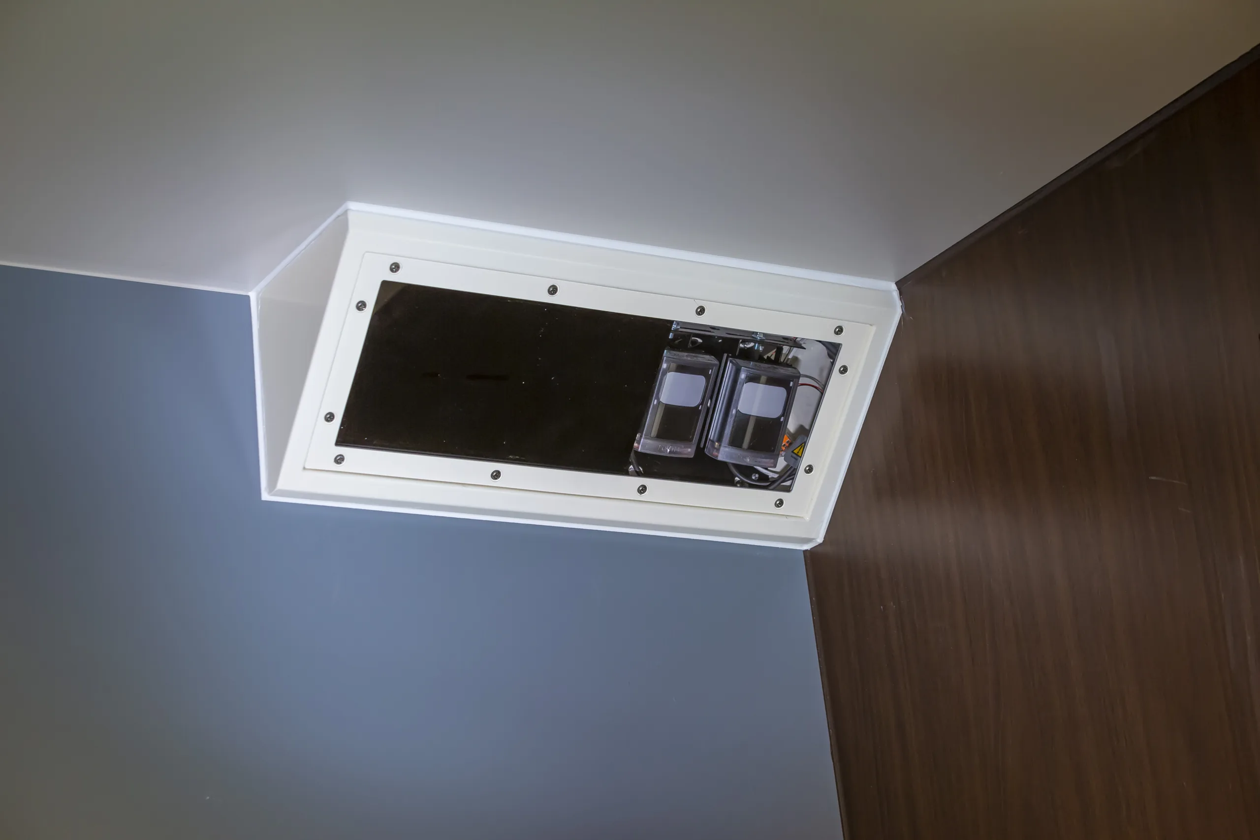 - Close-up of a ceiling with a rectangular black air vent. The vent is surrounded by a white frame and is attached to the juncture of a gray-blue and a dark wood textured wall.
