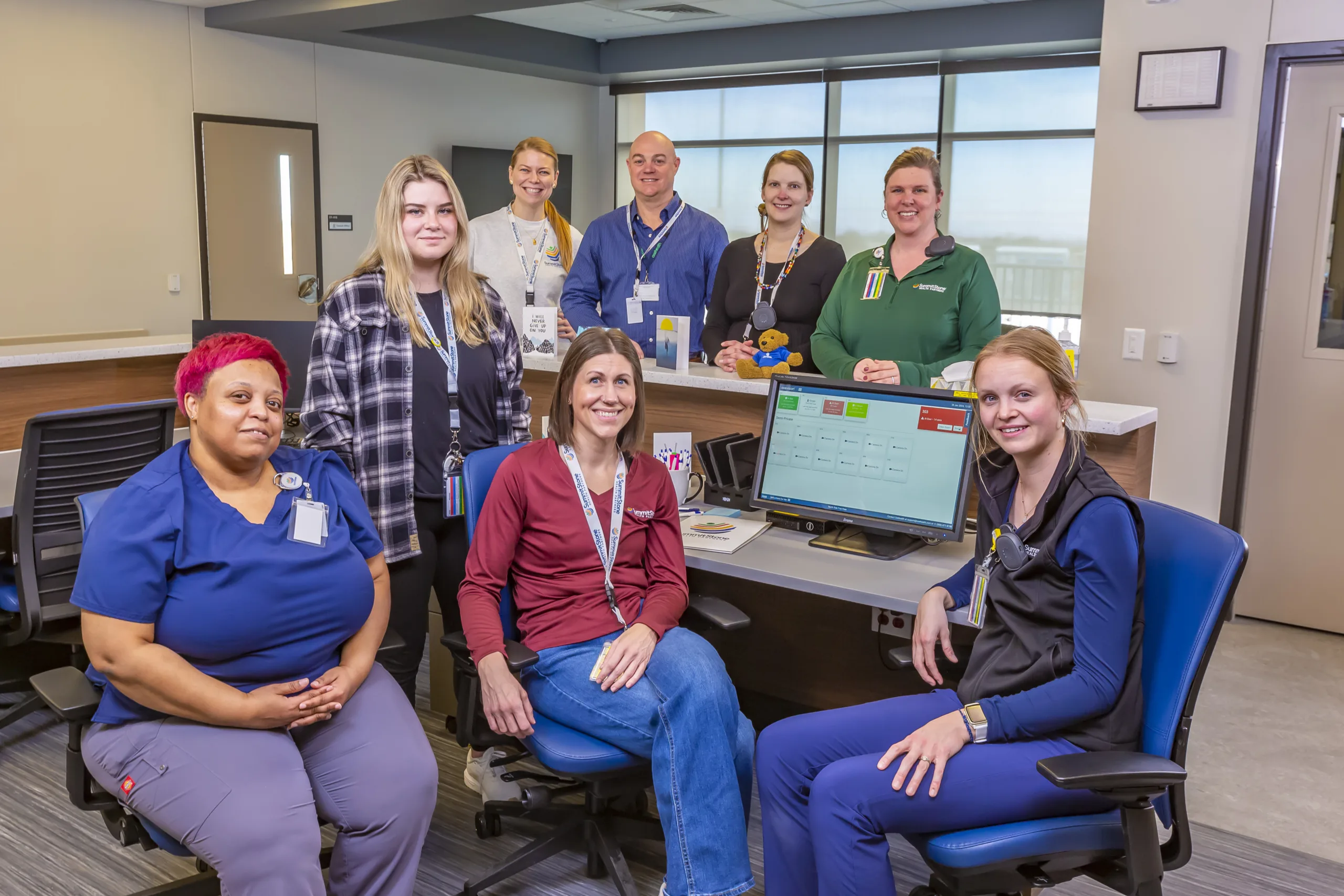 - A group of eight people, including healthcare workers and staff, are gathered in a medical office. Some are sitting, and others are standing behind a desk with computer monitors and medical equipment. They are smiling and appear to be part of a team.
