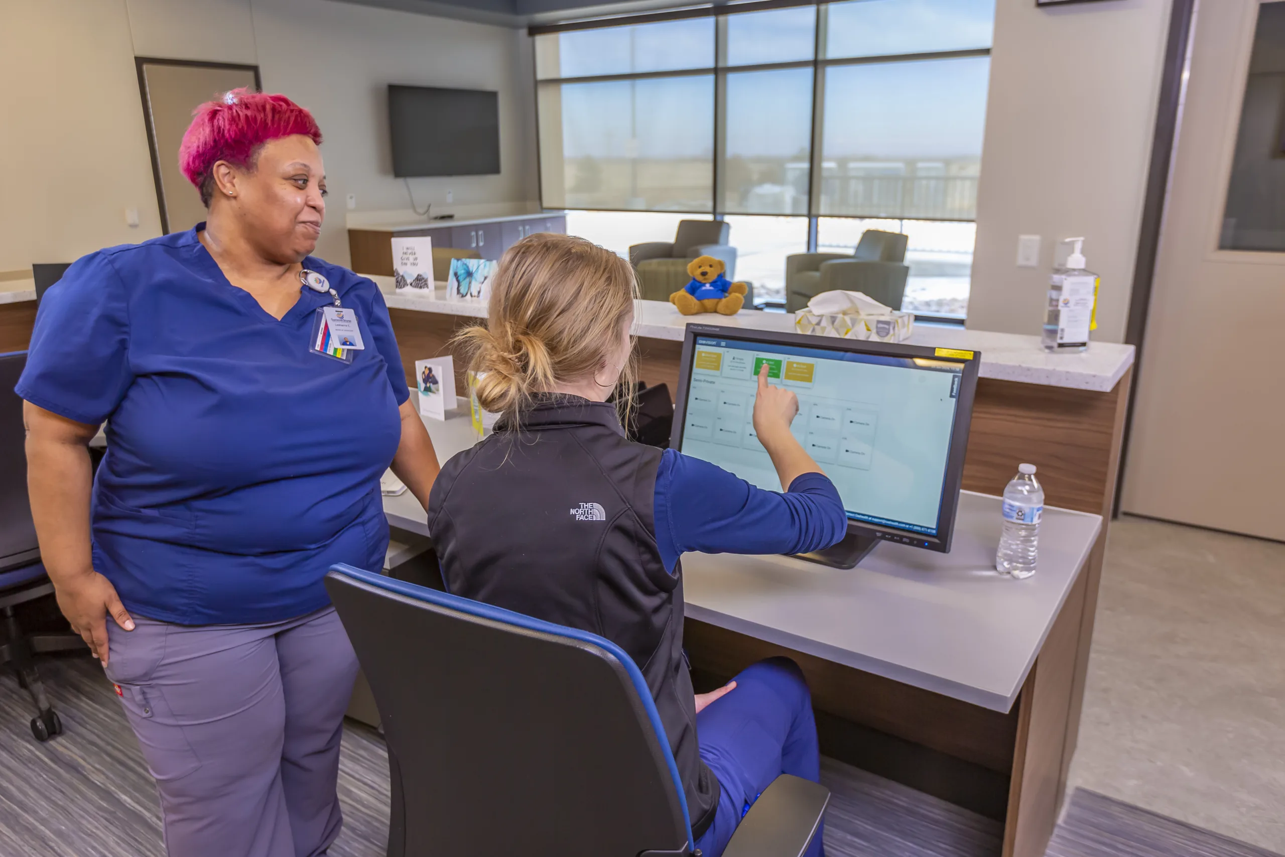 - A healthcare professional in blue scrubs consults with a colleague seated at a computer in a modern office. The seated person points at the screen, and a water bottle is on the desk. The room has large windows and a relaxed atmosphere.